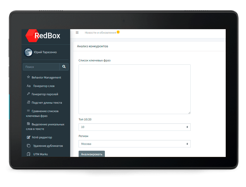 Чтобы анализировать ресурс, предварительно следует собрать список ключевых слов. В сервисе есть опция анализа по регионам. Проанализировать можно 10 или 20 релевантных ресурсов конкурентов. Загрузите список ключевых слов в специальную форму, выберите количество сайтов для анализа и жмите на опцию запуска анализа.