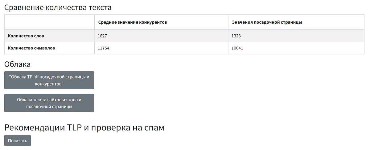 • сравнение текстов по количеству слов и символов со страницами конкурентов;