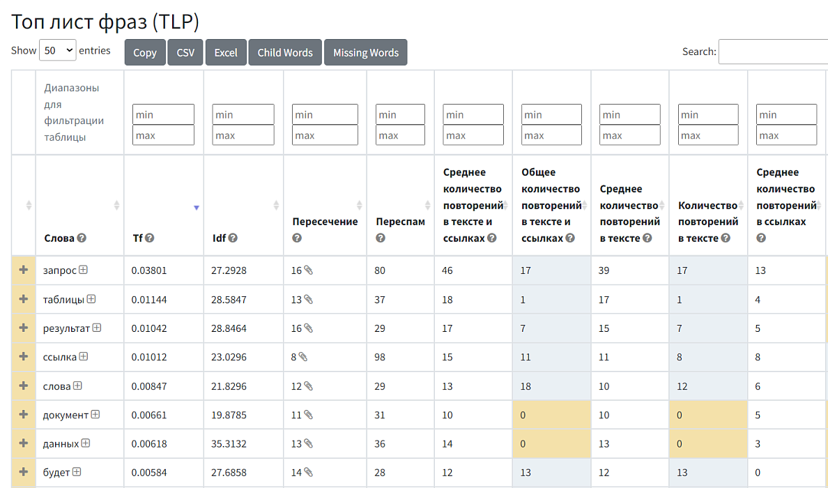 • сводную таблицу, по словам с сайтов конкурентов, перспам, пересечение с проверяемой страницей.